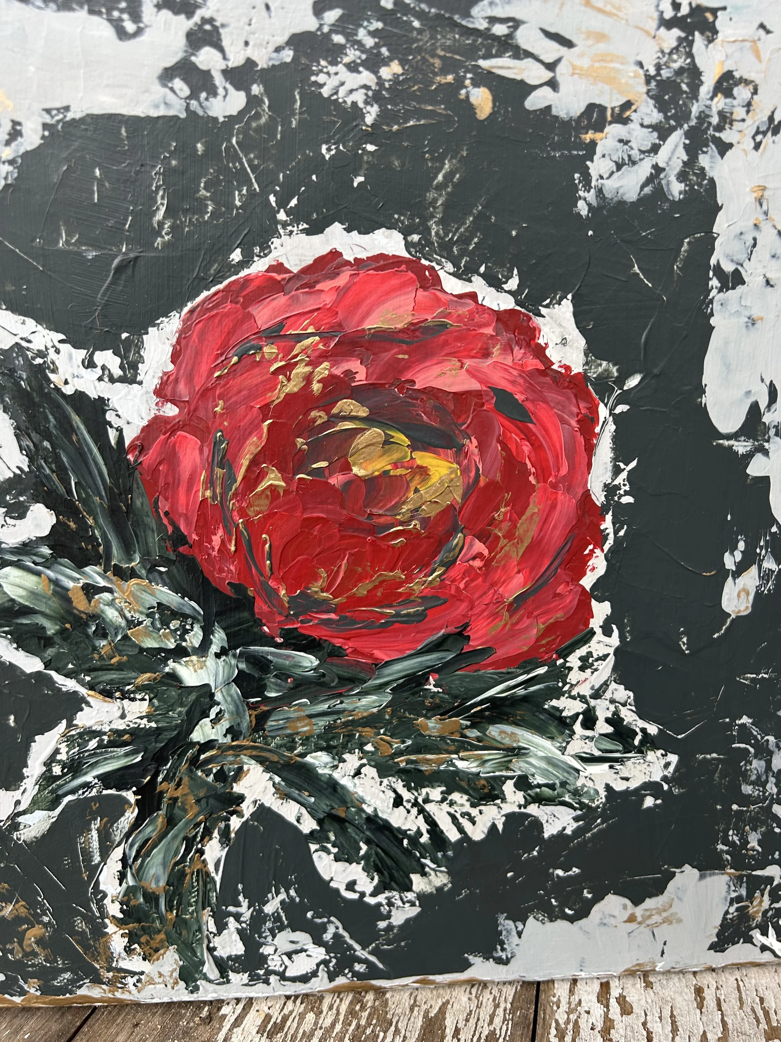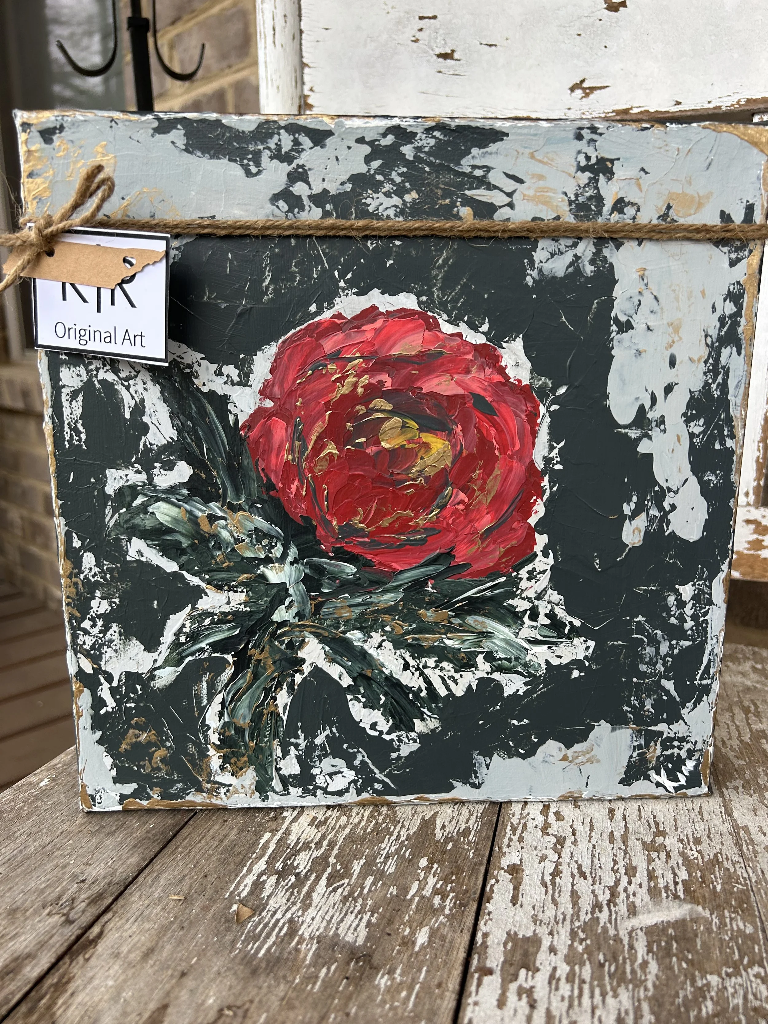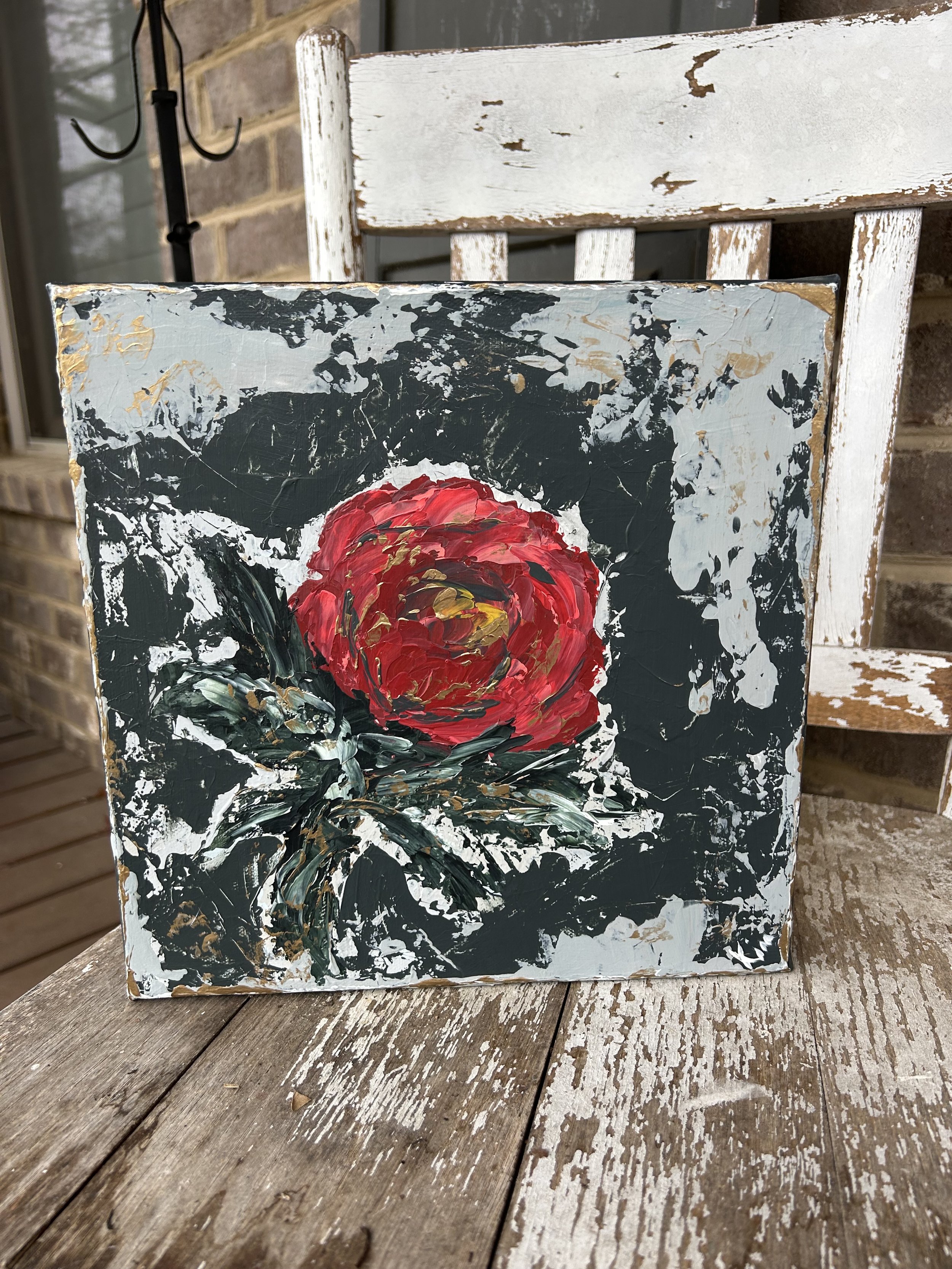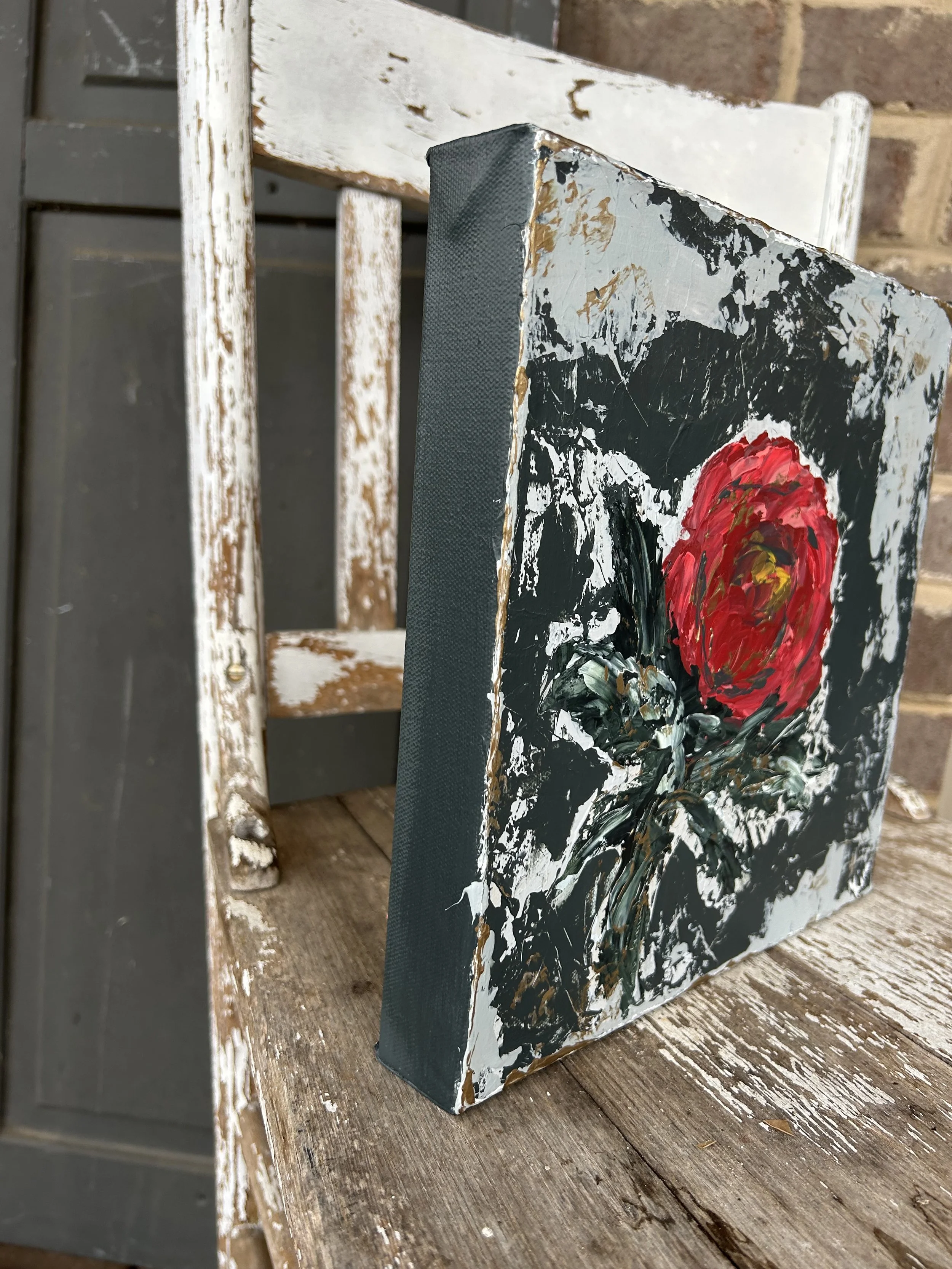 An abstract version of the Vintage Bouquets. This lone red flower stands out against the shades of black and gray. Hints of bronze accents add the final touch. Hand painted on a gallery wrapped canvas. Measures 10in x 10in.
