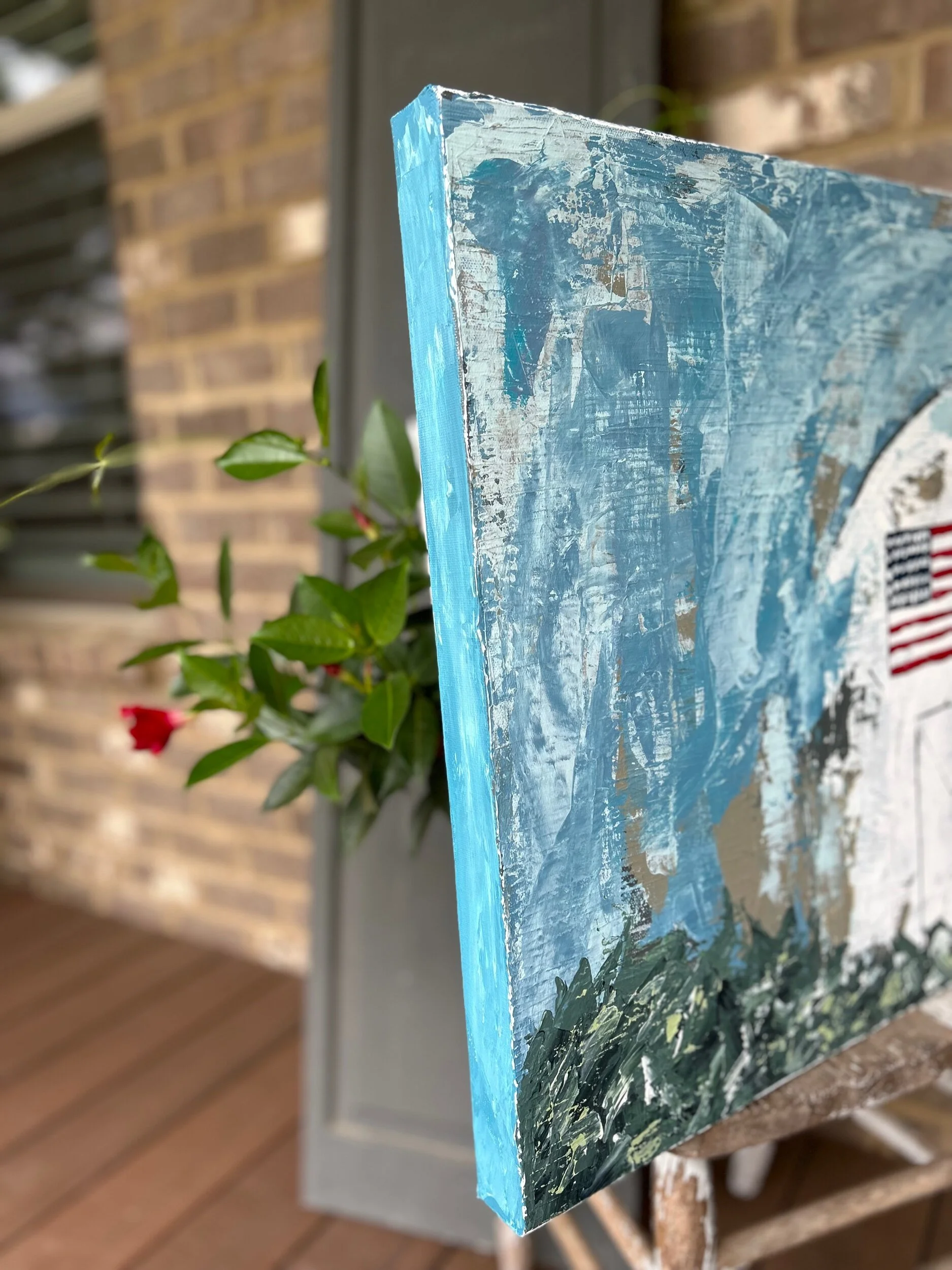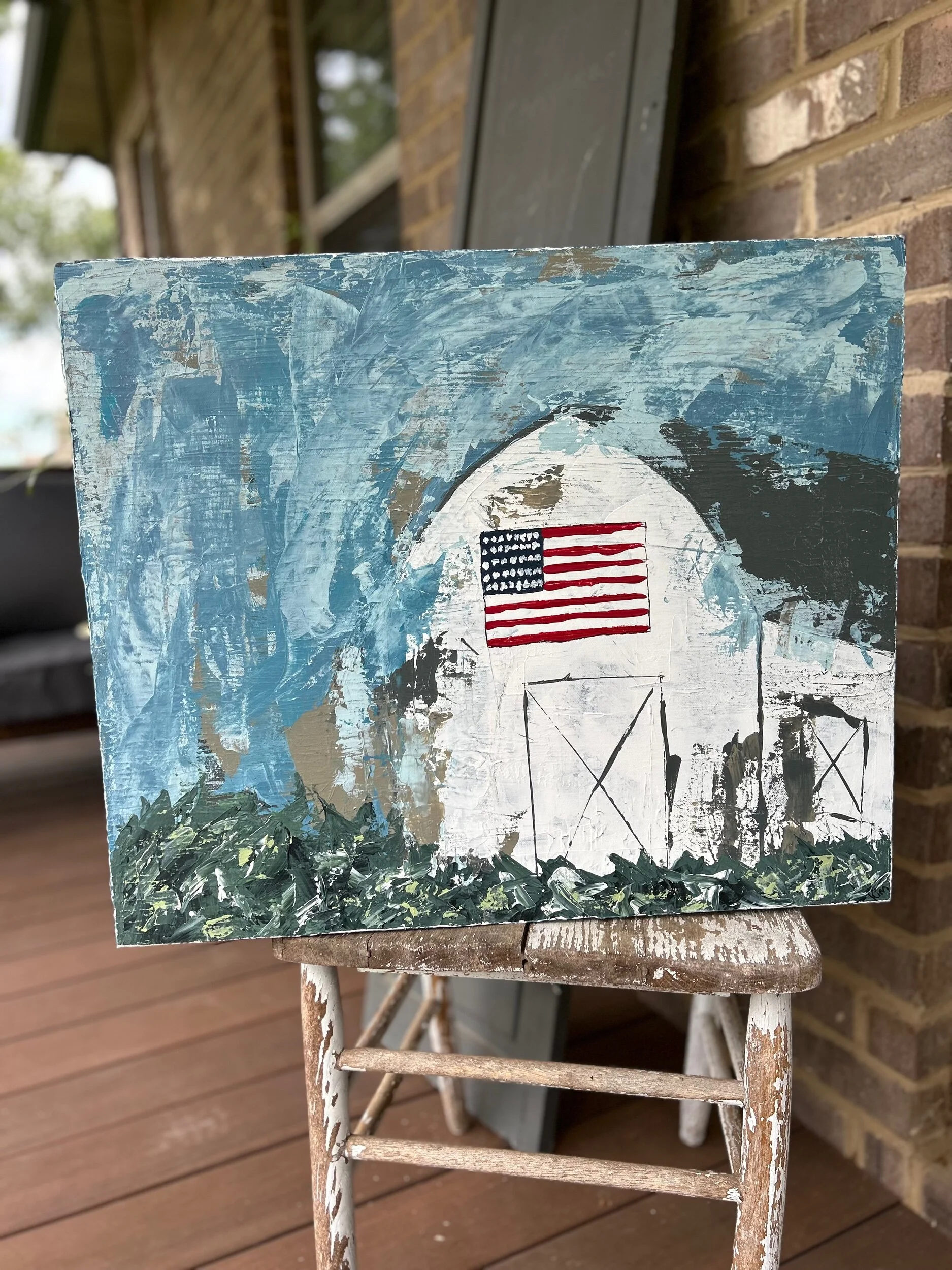 From the Americana series, this large abstract barn is adorned with the American flag. 20 in X 24in