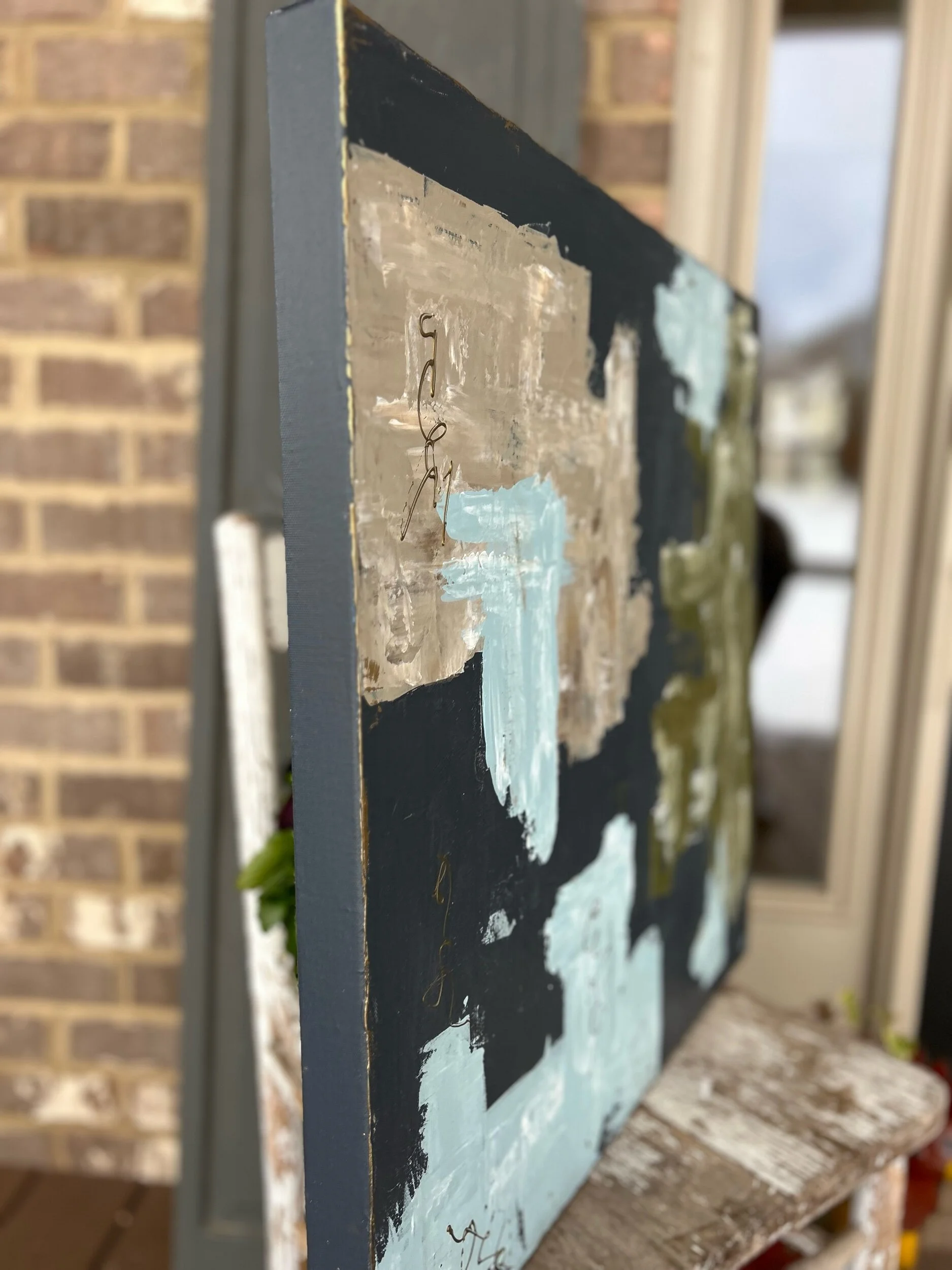 An abstract piece of blues, green, and sand tones with a touch of gold scribbles. Hand-painted on a gallery wrapped canvas. Measures 24in X 24in