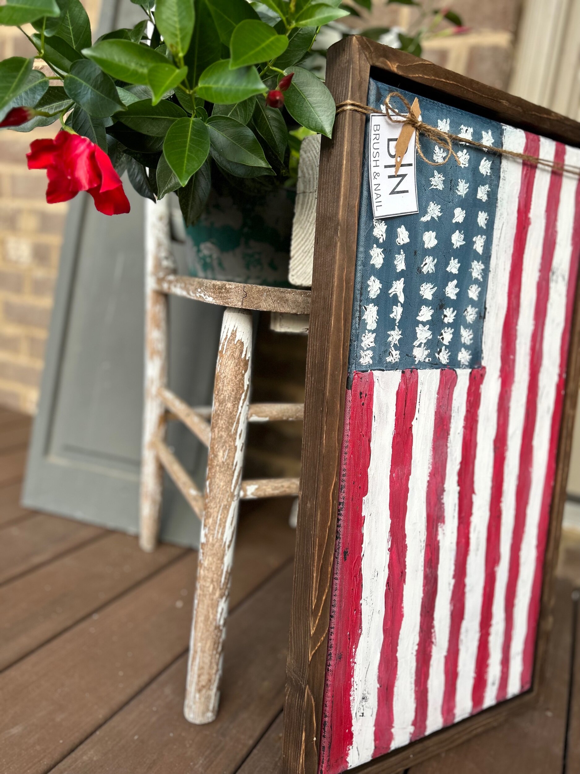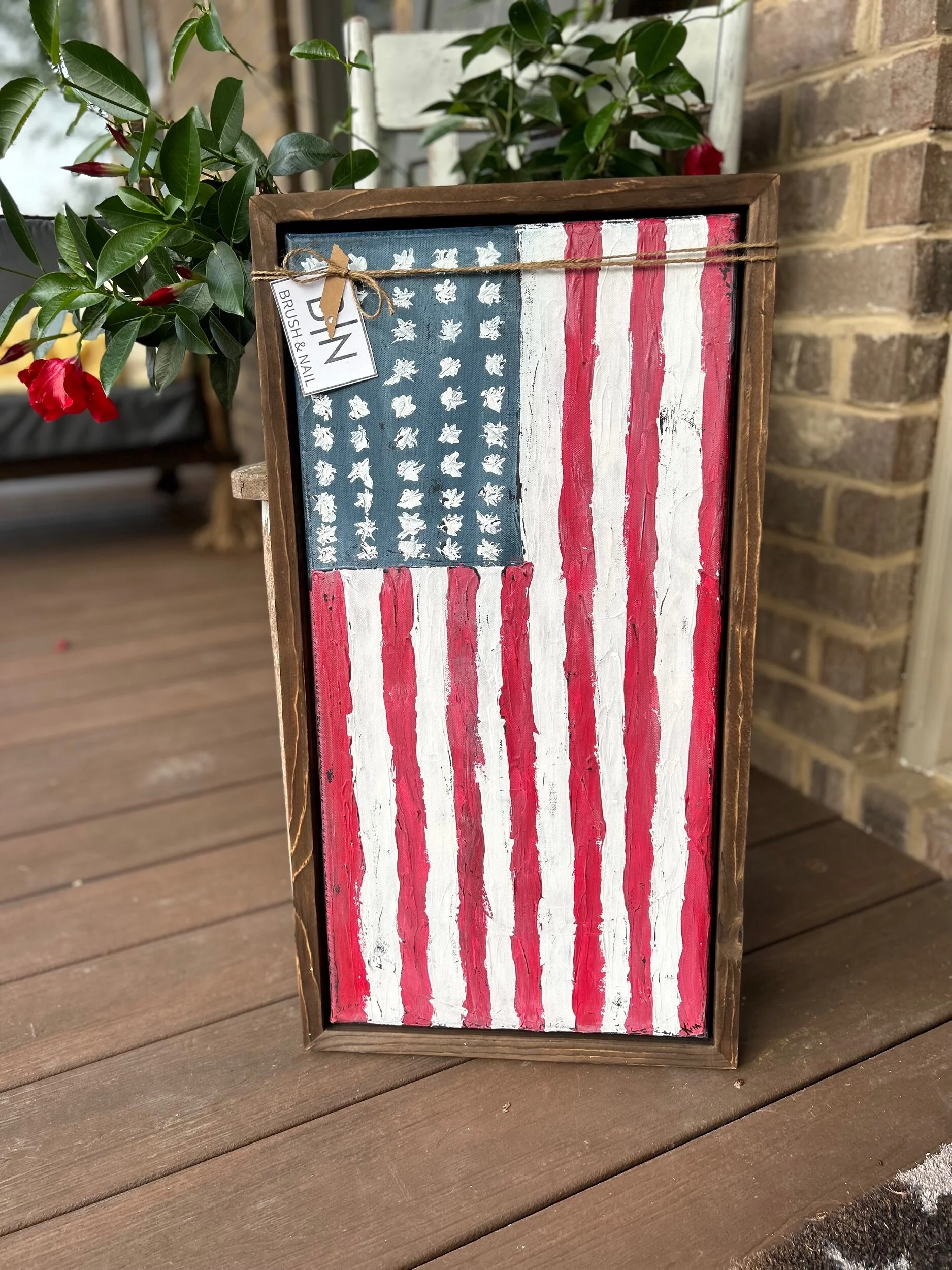 American flag painted in a vintage/distressed style. Framed in a custom frame. 14in X 26in