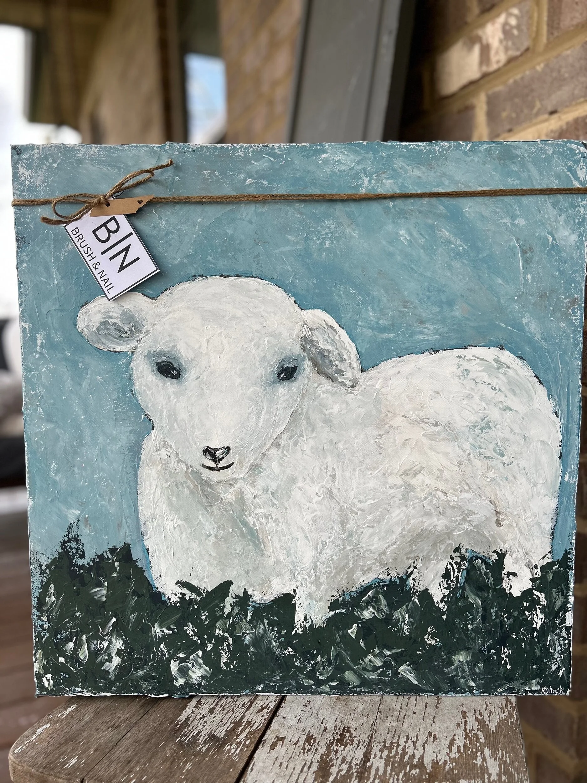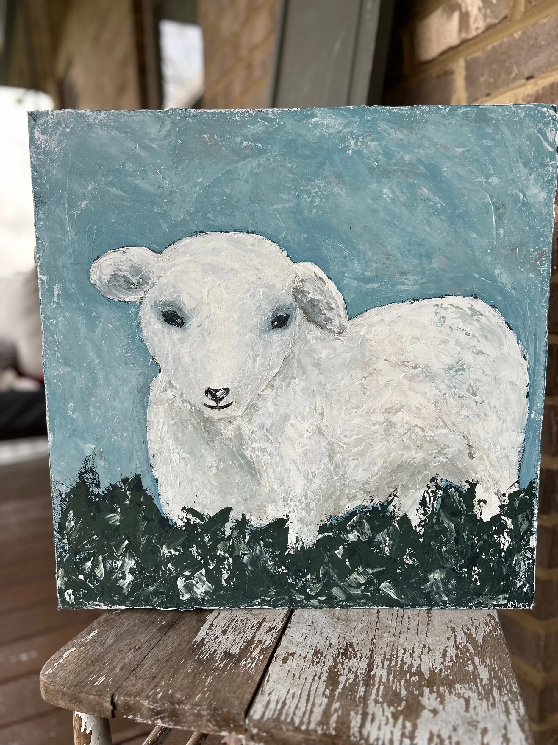 Textured lamb in a field with muted mixed blues background on canvas. Measures 20in X 20in x1.5in
